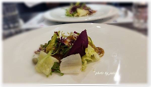 蘿美生菜、紫甘藍及一些堅果,分量適當,酸酸油醋醬汁,清新可口。