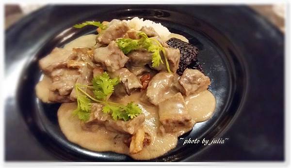 布蘭克牛肉,以各種蔬菜及香料放入湯中燉煮,再用高湯加鮮奶做成醬汁,食用時淋上醬汁,美味加分。