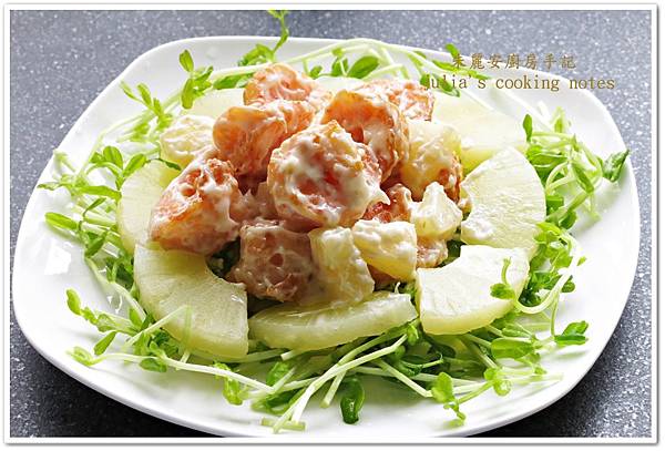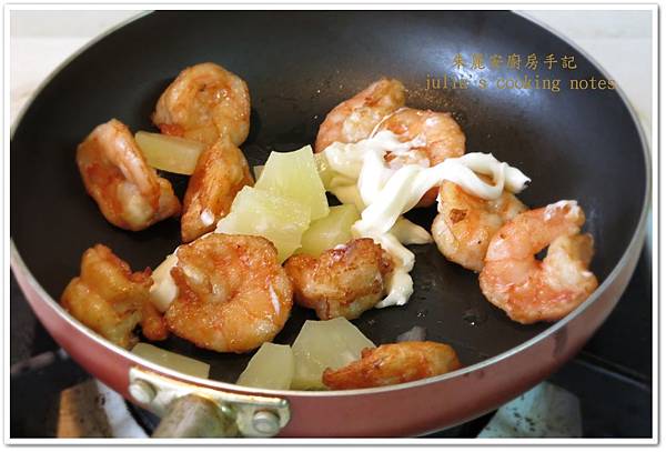 3.另起一鍋不放油,開小火將鳳梨、蝦球與美乃滋拌勻盛盤即可。