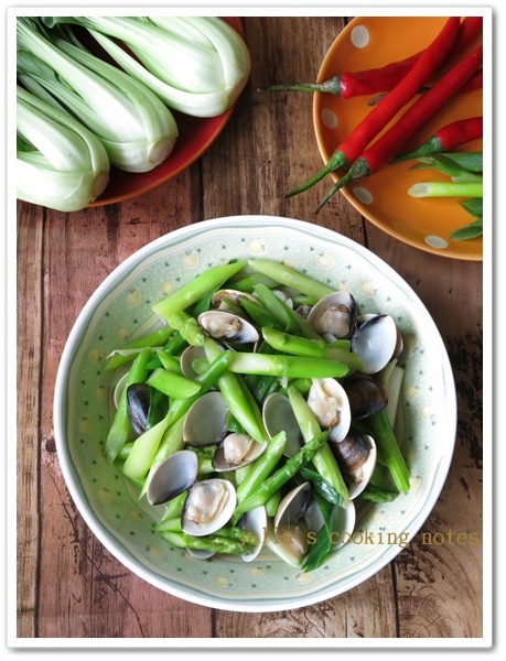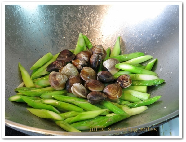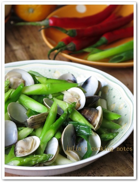 這道料理用的是粗枝綠蘆筍,新鮮綠蘆筍清炒後清脆甘甜,加入蛤蠣拌炒,更是鮮美爽口。