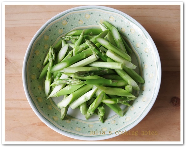 煮一鍋水,水滾後將綠蘆筍汆燙30秒撈起,漂一下冷水,再開始料理,