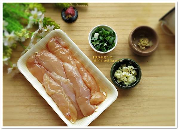 雞里肌肉200g 蒜末1大匙 薑末1茶匙 蔥花1大匙