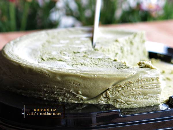 兩片餅皮吃起來緊實帶有淡淡綠茶香,