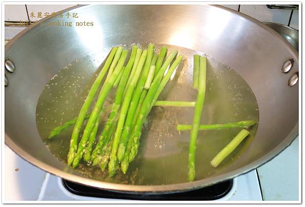 1、綠蘆筍削去老皮。煮一鍋水,水滾後將綠蘆筍放入煮20秒撈起過冷水備用。