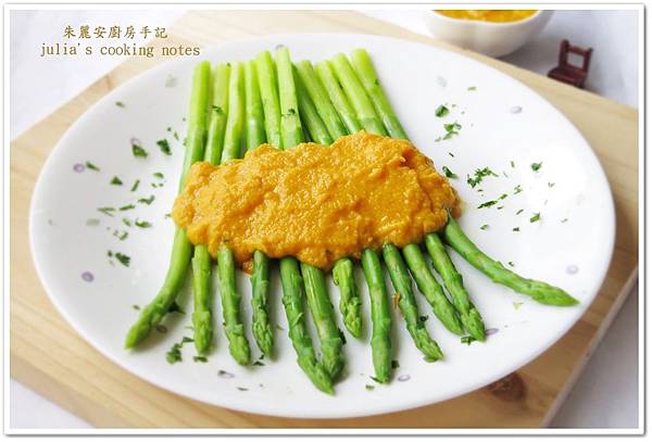 這道料理兩個步驟即可完成,綠蘆筍滾水燙熟,醬料全部丟入果汁機打。