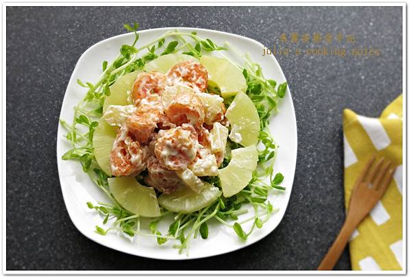**鳳梨蝦球擺盤時放一些鳳梨片、生菜或苜蓿芽,既可引食慾也可拌美乃滋當做沙拉食用。