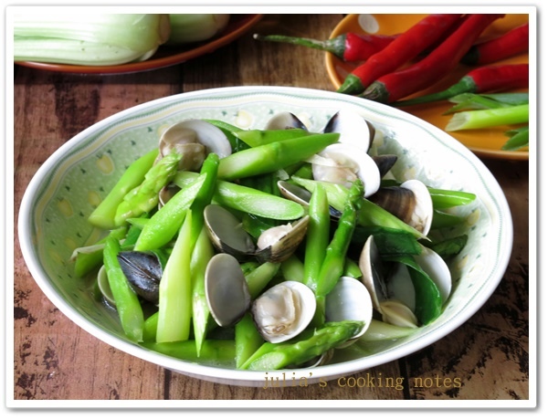 這道料理用的是粗枝綠蘆筍,新鮮綠蘆筍清炒後清脆甘甜,加入蛤蠣拌炒,更是鮮美爽口。